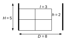 - Problema cărămizi de la test: Ionel vrea să construiască un zid între doi stîlpi verticali, de înălțime H, aflați la distanța D unul de altul. El dispune de cărămizi de lungime l și înălțime h pe care le așează orizontal, una după alta. Pe fiecare rînd orizontal Ionel așează cîte cărămizi încap, lăsînd eventual un gol la capătul din dreapta. În sus el se oprește atunci cînd, dacă ar mai așeza un rînd de cărămizi, zidul ar depăși înălțimea stîlpilor. Scrieți o schemă logică și apoi programul C care citește H, D, l și h și afișează numărul de cărămizi pe care trebuie să le așeze Ionel pentru a construi zidul. Exemplul din figură: dacă D = 8, H = 5, l = 3 și h = 2 atunci Ionel va avea nevoie de 4 cărămizi.
